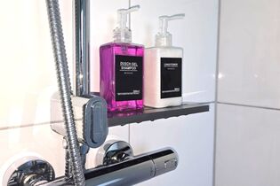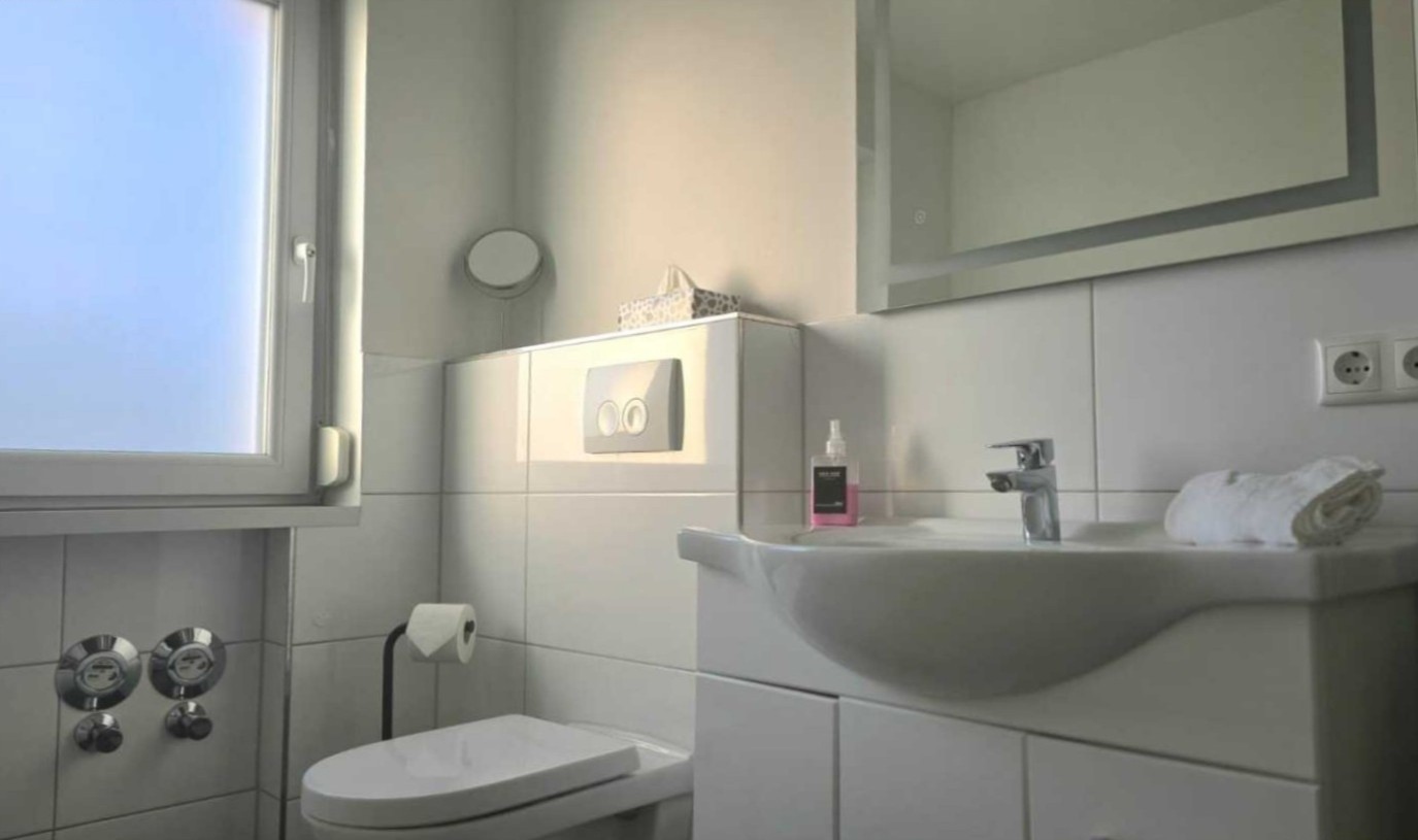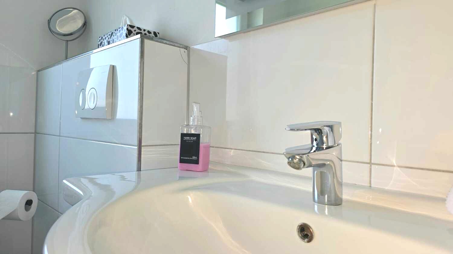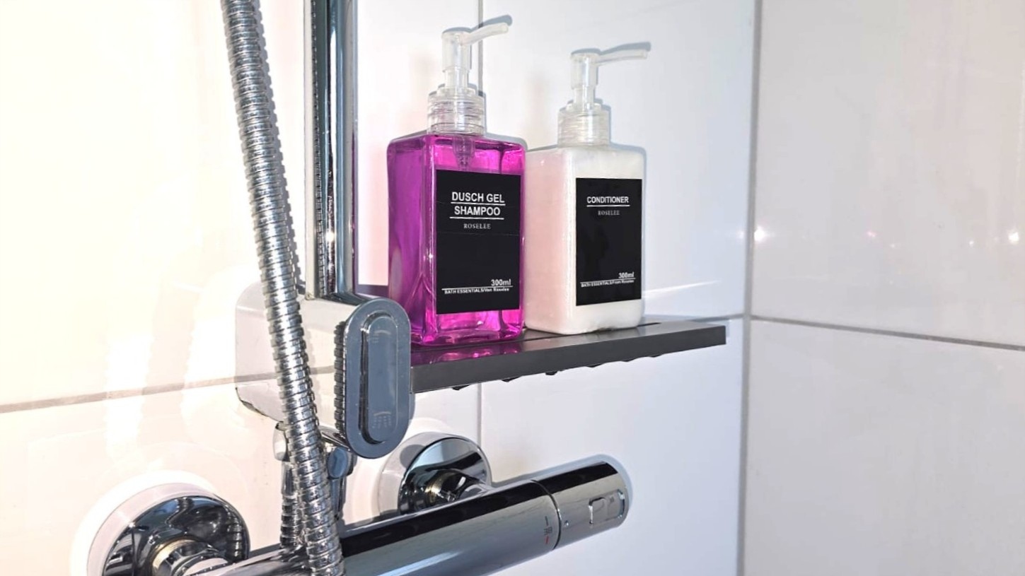 - Duschgel, Shampoo, Conditioner, Föhn, Kosmetikspiegel – alles da